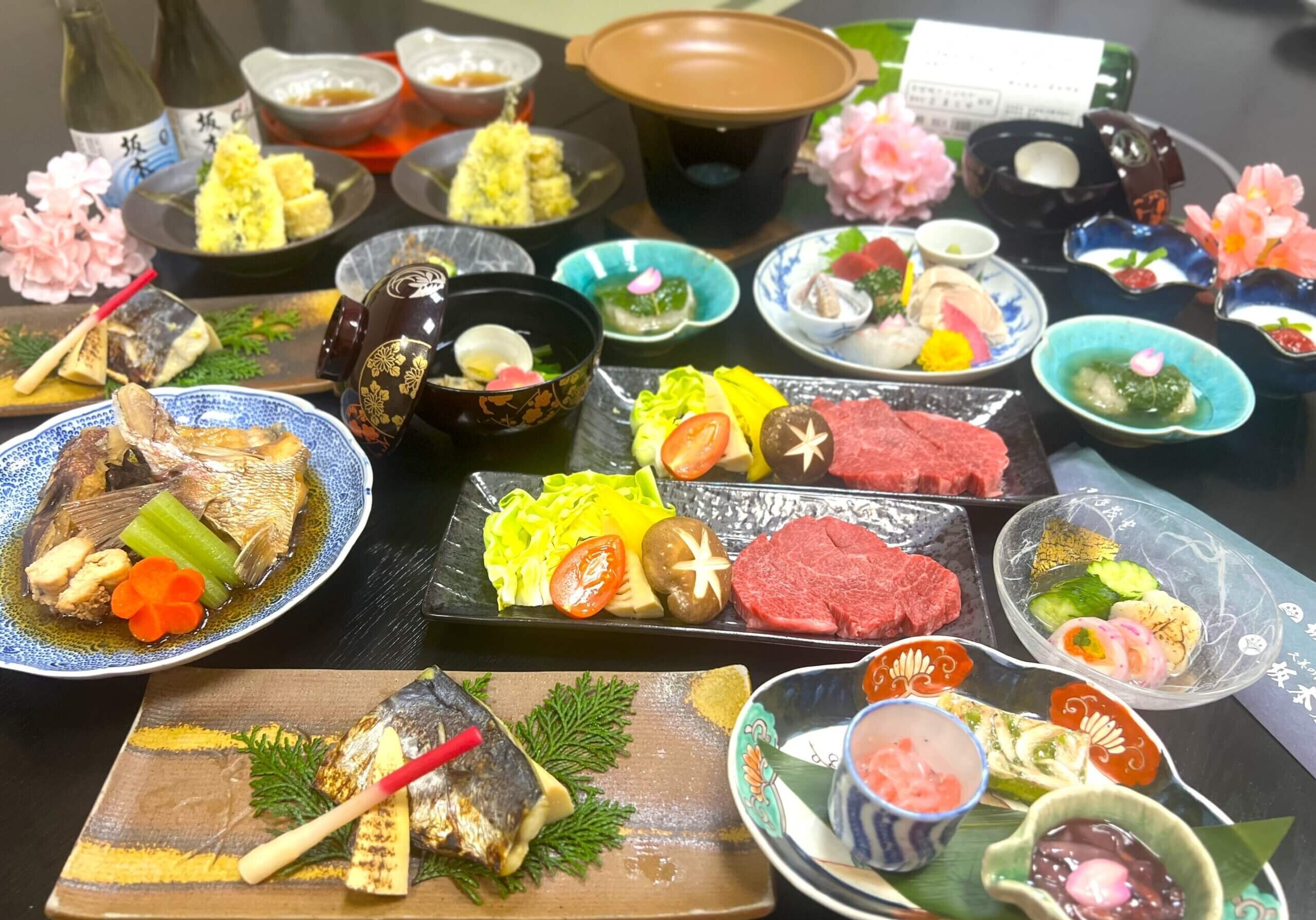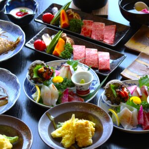 京丹後・久美浜は豊かな海の幸や農産物の宝庫です。 桜鯛、キジハタ、ホウボウ、イサキやアワビ、サザエ、 冬の松葉ガニ、牡蠣など丹後半島沖の日本海や久美浜湾 で水揚げされた四季折々の新鮮な魚介類。 地元産の野菜・果物などの食材が一年を通して楽しませてくれます。