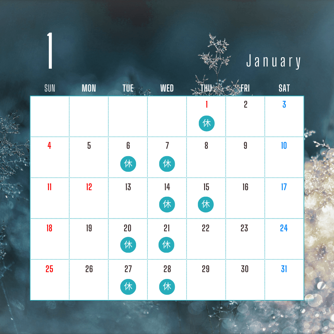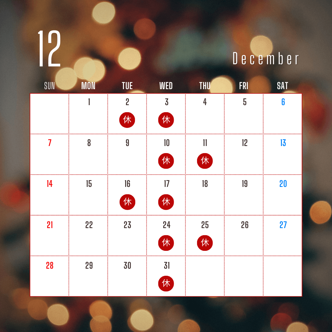 12月・1月休館日のお知らせ 2025.11.27 12月、来年1月の当館休館日カレンダーになります。 ※お休みの日のお電話やメール受付が承りにくくなりますのでご注意下さい。 お手数、ご迷惑をお掛け致しますが宜しくお願い致します。 Post Share LINE Pin it note